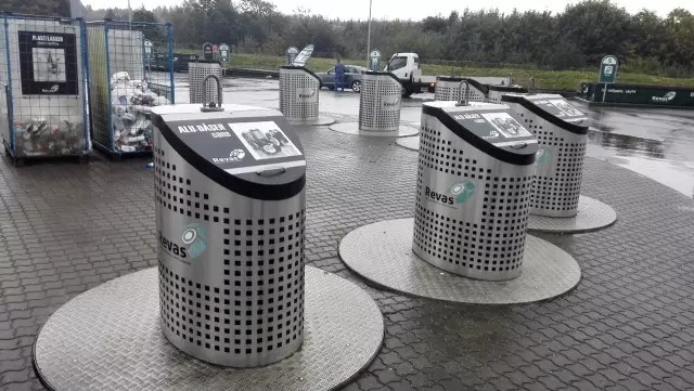 Revas的垃圾分類回收站有一個(gè)區(qū)域分布了幾個(gè)樣式別致的小垃圾桶,這些小垃圾桶是專供飲料罐和瓶子的,居民直接可通過(guò)這些垃圾桶把飲料罐和瓶子扔到地下的大集裝箱中,據(jù)Poul M?ller先生介紹,回收站地底下有100個(gè)集裝箱箱子用于飲料罐和瓶子的回收。