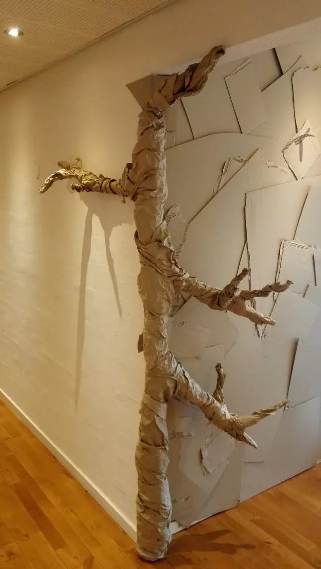 一上二樓直接映入眼簾,利用廢紙做的樹(shù)枝及廢紙片墻