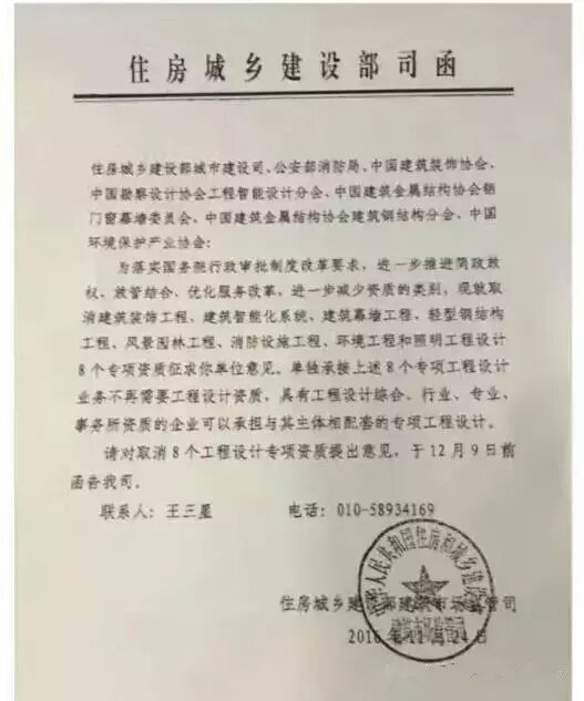 8個工程設(shè)計專項資質(zhì)包括:建筑裝飾工程,建筑智能化系統(tǒng),建筑幕墻工程,輕型鋼結(jié)構(gòu)工程,照明工程,消防設(shè)施工程,風(fēng)景園林工程和環(huán)境工程,向城市建設(shè)司、公安部消防局,中國建筑裝飾協(xié)會,中國勘察設(shè)計協(xié)會工程智能設(shè)計分會,中國建筑金屬結(jié)構(gòu)協(xié)會,中國建筑環(huán)境保護產(chǎn)業(yè)協(xié)會發(fā)出此征求意見函,要求在12月9日之前給予回復(fù)。