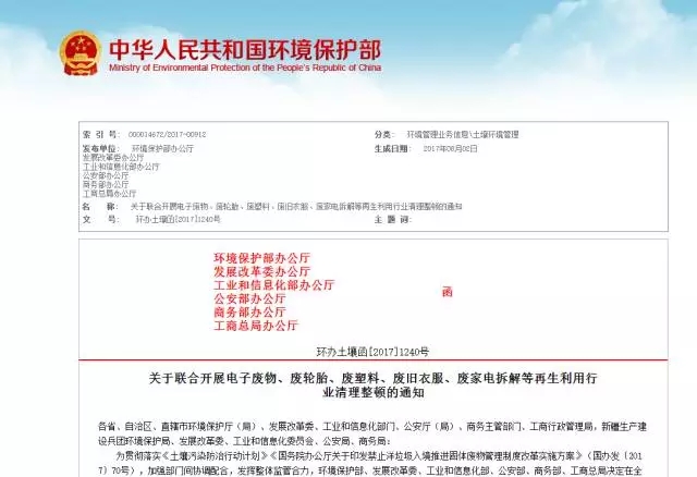 為貫徹落實《土壤污染防治行動計劃》《國務(wù)院辦公廳關(guān)于印發(fā)禁止洋垃圾入境推進(jìn)固體廢物管理制度改革實施方案》(國辦發(fā)〔2017〕70號),環(huán)境保護(hù)部聯(lián)合發(fā)展改革委、工業(yè)和信息化部、公安部、商務(wù)部、工商總局開展電子廢物、廢輪胎、廢塑料、廢舊衣服、廢家電拆解等再生利用行業(yè)清理整頓。