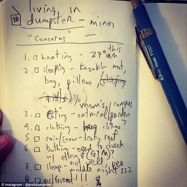 他飛跑去向教務(wù)長申請: “我想把校園草坪上的垃圾箱變成一個微小的可持續(xù)的家,并到里面去住。” 教務(wù)長雖然不是很懂這個教授的腦回路,但是想想垃圾箱也不貴,就同意了。