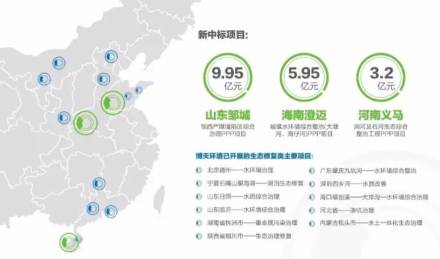近日,博天環(huán)境集團(tuán)(603603.SH)通過聯(lián)合體合作方式分別贏取了位于山東省鄒城市、河南省義馬市和海南省澄邁縣的三個(gè)生態(tài)修復(fù)類項(xiàng)目。其中山東省鄒城市鄒西產(chǎn)煤塌陷區(qū)綜合治理PPP項(xiàng)目,投資概算約9.95億元;河南省義馬市澗河及石河生態(tài)綜合整治工程(PPP),項(xiàng)目總投資約3.2億元;海南省澄邁縣城鎮(zhèn)水環(huán)境綜合整治(大塘河、海仔河)PPP項(xiàng)目,估算總投資5.95億元。