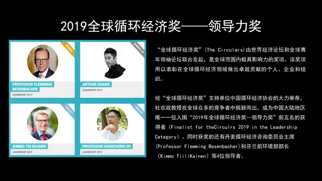 從我們國家來講,全國200多個(gè)大中城市,每年會(huì)產(chǎn)生2億多噸的垃圾,這個(gè)量非常大,如果中國的垃圾分類工作做好了,全世界的循環(huán)經(jīng)濟(jì)的工作就做好了三分之一,所以達(dá)沃斯世界經(jīng)濟(jì)論壇設(shè)立了一個(gè)全球循環(huán)經(jīng)濟(jì)獎(jiǎng),專門獎(jiǎng)勵(lì)這方面的企業(yè)和領(lǐng)導(dǎo)人、專家,很榮幸在2019年,我作為中國大陸唯一的一個(gè)人入圍了它的領(lǐng)導(dǎo)力獎(jiǎng)。