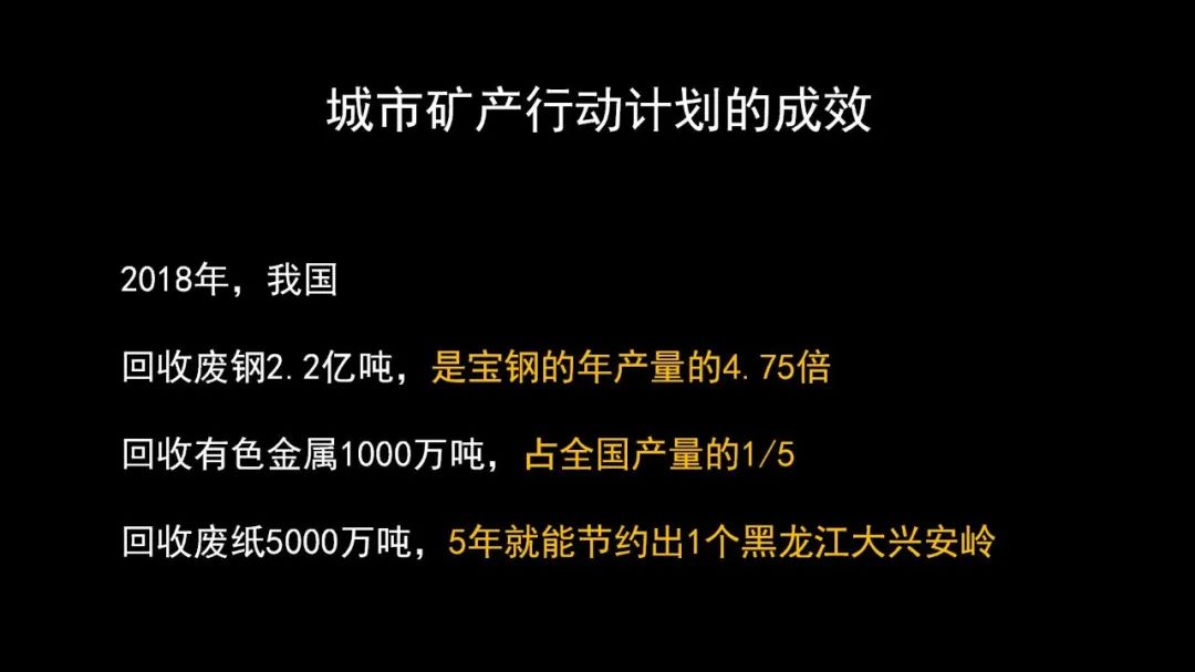從2009年我們實(shí)施城市礦產(chǎn)行動(dòng)計(jì)劃,到2018年,有什么樣的效果呢,大家看這幾組數(shù)據(jù)就知道了。2018年,我們回收的廢鋼鐵是2.2億噸,大概相當(dāng)于中國寶鋼2018年產(chǎn)量的4.75倍;我們回收的再生有色金屬是1000萬噸,當(dāng)年我們有色金屬產(chǎn)量是什么呢?5000萬噸,占了全年的五分之一;2018年回收的廢紙是5000萬噸,這5000萬噸廢紙如果連續(xù)5年回收使用,相當(dāng)于我們一個(gè)大興安嶺的森林來解決我們用紙的問題。