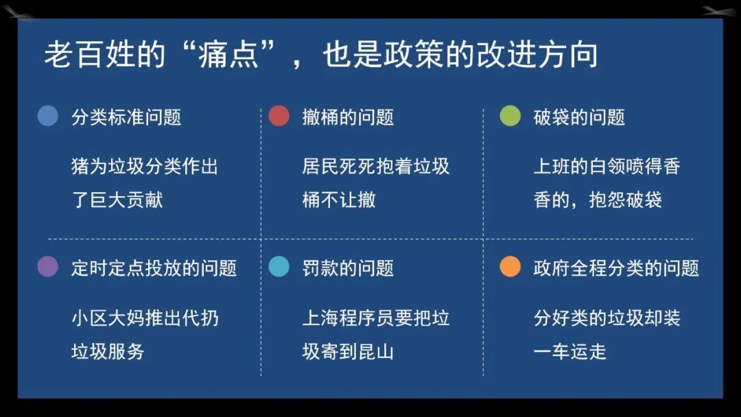 大家看一看,這是當(dāng)時(shí)老百姓被垃圾分類的問題逼瘋了,他們就編了一個(gè)歌,說你的分類標(biāo)準(zhǔn)到底是怎么定的,要讓我們這么難分?在這里面大家發(fā)現(xiàn),因?yàn)槔诸惛總€(gè)人都有關(guān),所以政策處理過程當(dāng)中就非常重要了。