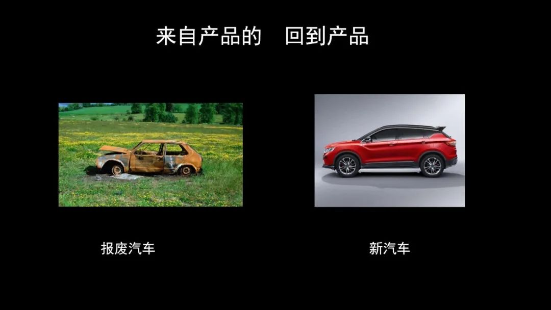 我們家報(bào)廢的舊汽車,把里面的金屬,把里面的銅鋁 鐵、塑料回收,可能變成你家接下來要的新汽車,我想這就是來自產(chǎn)品,回到產(chǎn)品。