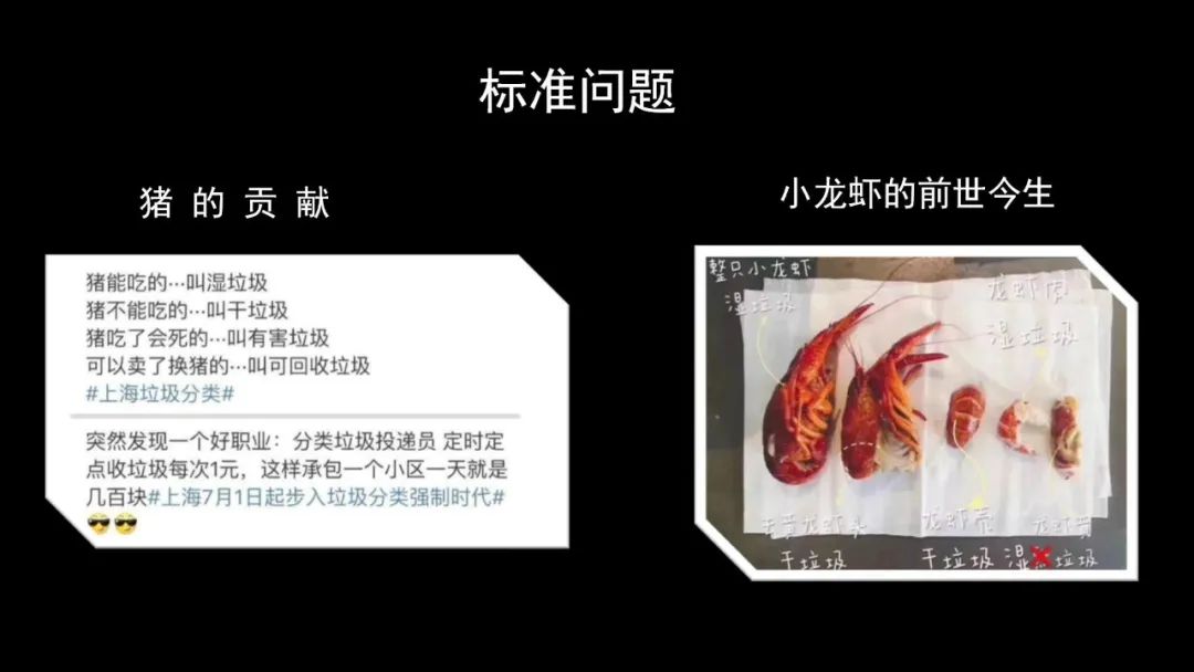 “豬能吃的叫濕垃圾,豬不能吃的叫干垃圾,豬吃了會(huì)死的叫有害垃圾,賣了能買豬肉吃的叫做可回收垃圾”,很形象吧,這是標(biāo)準(zhǔn)的問題;