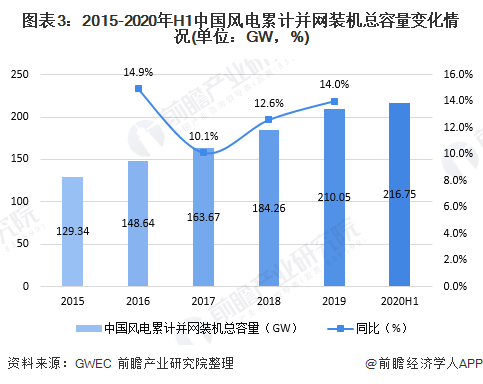 我國風電產(chǎn)業(yè)在近幾年得到快速發(fā)展,風電裝機容量快速增長,2019年,我國風電裝機容量達到了210.05GW,同比增長14%,截至2020年上半年,我國我國風電裝機容量達到了216.75GW。