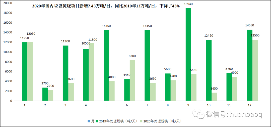 稍加留意就會發(fā)現(xiàn),相較于前兩年的大項目頻現(xiàn),各家企業(yè)中標捷報頻傳,2020年類似的報道少了許多,全國釋放的垃圾焚燒項目罕見下滑,新增項目開始“降溫”。這一現(xiàn)象,筆者早在去年6月就注意到了,當時還以為是受疫情的影響,但其實大家都想錯了。據(jù)筆者長期跟蹤各省政府采購網(wǎng)統(tǒng)計得出,2020年1月-12月,國內(nèi)新中標的垃圾焚燒發(fā)電項目累計72個,相比2019年新中標120個項目減少48個,同比下滑了40%;新增日處理規(guī)模7.43萬噸/日,相比2019年近13萬噸/日的新增規(guī)模,同比減少了43%;總投資373億元,相比2019年總投資600億元也減少了227億元,降幅達到37.83%。(項目清單詳見文末)看得出來,2020年國內(nèi)釋放的垃圾焚燒項目,無論是中標數(shù)量,還是日處理規(guī)模,亦或是總投資額,與2019年相比都有4-5成左右的下滑,下降的不是一點點,而是幾乎“腰斬”。從月份來看,除了1月、4月、6月,2020年新增的日處理規(guī)模較2019年有所增長外,其余每個月份都有著不同程度的下滑,少則3-6千噸/日,多則上萬噸/日。其中,5月、7月、9月、10月四個月的下降幅度最大,均是萬噸/日級別以上的減少。(如圖一、圖二所示)圖一:2019年VS2020年,全國釋放的垃圾焚燒項目規(guī)模對比圖二:2020年國內(nèi)垃圾焚燒項目新增7.43萬噸/日,同比下降了43%02