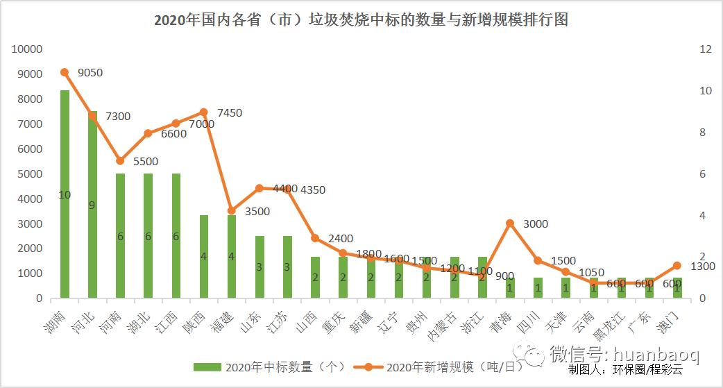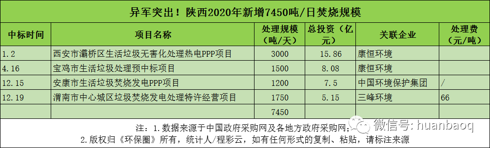 從項目分布的省份來看,2020年定標的72個垃圾焚燒項目,分別分布在湖南、湖北、河南、河北、江西、陜西、福建、山東、江蘇等23個省市,其中湖南、湖北、江西、陜西在垃圾焚燒領(lǐng)域大放異彩,成為全國興建垃圾焚燒廠數(shù)量最多、新增規(guī)模最大的4個省份(如圖三、圖四所示)。圖三:2020年定標的72個垃圾焚燒項目,分布的省市圖四:2020年國內(nèi)各?。ㄊ校├贌袠说臄?shù)量、新增規(guī)模排行但與此同時,總體上看,2020年國內(nèi)絕大多數(shù)地區(qū)垃圾焚燒投資速度都是在放緩的,政府招投標活動不及2019年,下滑幅度最大的是“冀魯豫”三省。以河南為例,2019年河南省累計開標26個垃圾焚燒項目,新增處理規(guī)模3.22萬噸/日;而到了2020年,則只有6個垃圾焚燒項目完成評標,新增處理規(guī)模5500噸/日,只有2019年的“零頭”。在河北,2019年全省新增21個垃圾焚燒項目,新增處理規(guī)模2.51萬噸/日;而到了2020年,這一數(shù)據(jù)則下滑到9個項目,新增處理規(guī)模7300噸/日,不足2019年的1/3。還有山東省,2019年山東全省共有11座垃圾焚燒項目完成定標工作,新增處理規(guī)模近萬噸/日;而2020年,山東則只有3個垃圾焚燒項目開啟招標,新增規(guī)模不及2019年的一半。與以上這些省份相比,“兩湖兩西”--湖南、湖北、山西、陜西4省,則在其他省市投資速度放緩時“”異軍突起,不懼國補滑坡的負面效應(yīng),在2020年迎來了垃圾焚燒市場的大爆發(fā)。4省之中,湖南省“一馬當先”。省內(nèi)永州、常德、益陽、張家界、常寧、邵陽等城市紛紛開啟招投標工作,2020年共有10個垃圾焚燒項目完成定標,新增9050噸/日的處理規(guī)模,僅光大環(huán)境一家就斬獲其中7個項目,吃掉了70%的市場份額,成為湖南垃圾焚燒市場的“大贏家”(如圖五所示)。湖北也是“不甘落后”。雖然釋放速度不及湖南,但去年也是新增了6個垃圾焚燒大標,其中4個都是千噸級別的項目,宜昌市垃圾焚燒項目更是難得一見2250噸/日的大項目,吸引了光大環(huán)境、中國環(huán)境保護集團、綠色動力、深能、康恒環(huán)境等固廢大咖前來競標(如圖六所示)。還有江西省。據(jù)《環(huán)保圈》跟蹤發(fā)現(xiàn),2019年江西垃圾焚燒新增規(guī)模共計3400噸/日,而2020年這一數(shù)據(jù)則攀升至7000噸/日,其中5個垃圾焚燒項目都是千噸級別以上(如圖七所示)。增長最明顯還屬陜西省。據(jù)《環(huán)保圈》進一步跟蹤,2019年陜西境內(nèi)大多生活垃圾還靠填埋,垃圾焚燒普及率非常低,鄰避矛盾突出。而到了2020年,西安灞橋區(qū)、寶雞市、安康市、渭南中心城區(qū)等地紛紛開啟項目招投標工作,雖然只有4個項目完成了定標工作,但處理規(guī)模也一躍達到7500噸/日,僅次于湖南(如圖八所示)。03