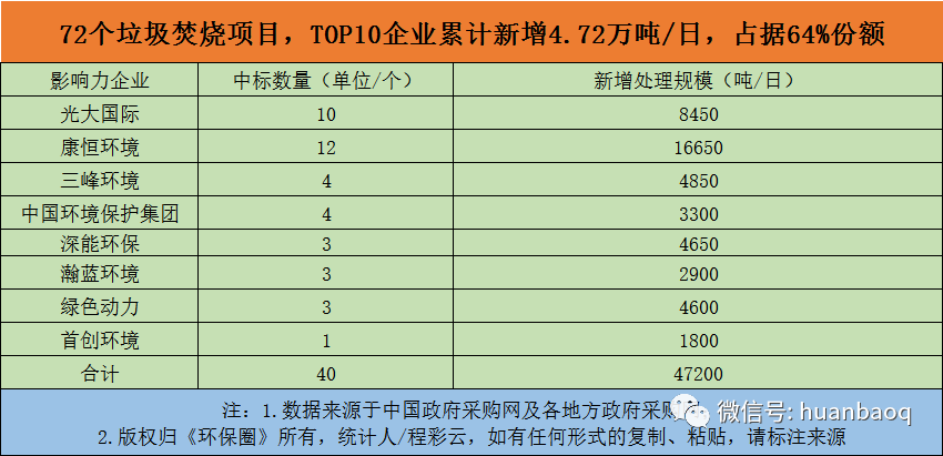 說到行業(yè)集中度,先回顧一下2019年的情況。在2019年釋放的120個垃圾焚燒項目中,光大環(huán)境、康恒環(huán)境、中國環(huán)境保護、首創(chuàng)環(huán)境等業(yè)內(nèi)影響力企業(yè)累計中標60座垃圾焚燒項目,占比全國新增項目的50%,日處理規(guī)模高達66550噸,約占全國新增處理規(guī)模的52%。僅光大環(huán)境一家,就“吃掉”了全國22%的份額。2019年斬獲22個項目新增2.87萬噸/日規(guī)模,約占2019年全國新增處理規(guī)模的22%,在國內(nèi)垃圾焚燒版圖中,已經(jīng)實現(xiàn)了“五分天下有其一”。據(jù)筆者進一步觀察,2020年定標的72個垃圾焚燒項目,還是被業(yè)界熟知的康恒環(huán)境、光大環(huán)境、偉明環(huán)保、海螺投資、三峰環(huán)境、綠色動力、中國環(huán)境保護等在內(nèi)22家固廢龍頭企業(yè)“瓜分”(如圖十所示)。圖十:22家固廢龍頭企業(yè)“瓜分”72個垃圾焚燒項目有意思的是,與2019年相比,2020年絕大多數(shù)固廢企業(yè)拿單能力減弱,比如光大環(huán)境,2019年入手了22個項目,新增2.87萬噸/日的焚燒規(guī)模;而到了2020年則只斬獲了10個項目,新增規(guī)模不足1萬噸/日,約8450噸/日,且集中在湖南地區(qū)。再比如城發(fā)環(huán)境,受河南垃圾焚燒市場的萎縮,城發(fā)環(huán)境2020中標的垃圾焚燒項目減少了一半,只拿到5個項目,其中有4個位于河南,還有1個選址新疆昌吉市。值得一提,在其他家企業(yè)投資放緩時,業(yè)界“黑馬”康恒環(huán)境則逆勢崛起,首超光大環(huán)境,2020年共獲12個垃圾焚燒訂單,新增16650噸/日處理規(guī)模,位居行業(yè)首位。繼續(xù)統(tǒng)計2020年業(yè)界十大影響力企業(yè)所占的市場份額,《環(huán)保圈》發(fā)現(xiàn),2020年這些企業(yè)累計斬獲40個,占全國新增項目的57%,較2019提升了7%的增長點,累計新增規(guī)模高達4.72萬噸/日,占全國新增規(guī)模64%,較2019提升了13%的增長點。(如圖十一所示)圖十一:2020年TOP10影響力企業(yè)中標數(shù)量、新增規(guī)模這再次印證,在“馬太效應(yīng)”下,垃圾焚燒領(lǐng)域“強者恒強”的局面愈發(fā)凸顯,行業(yè)集中度已由2019年的50%提升至2020的64%,“一家獨大,多強并進”的局面已然形成。所以就不難理解,為何中標的企業(yè)總是那幾家了。不過話說回來,即便這些企業(yè)拿單能力突出,跑馬圈地“圈”了許多項目,但并不意味著前途就一片光明,以后發(fā)展就能順風順水了。挑戰(zhàn)其實才剛剛開始?;蛟S前不久光大環(huán)境總裁王天義的一番話更能說明其中的道理。他說:受國內(nèi)市場日趨飽和、PPP模式政府調(diào)價、國補退坡、垃圾分類等因素的影響,光大環(huán)境已經(jīng)感覺到“不舒適”了。