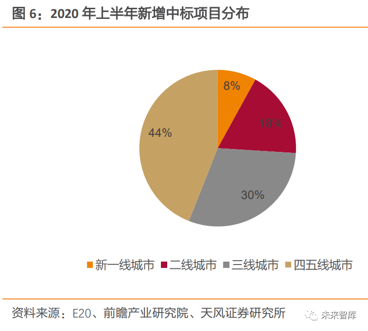 新增產(chǎn)能增速放緩,市場向四五線城市下沉趨勢明顯。2017 年以來,全國垃圾焚燒發(fā)電項目新增投產(chǎn)規(guī)模較大,如2019年新增投產(chǎn)高達 9.53 萬噸/日。但新增產(chǎn)能增速已由 2017年 53%下降至 2019年 10%。且從 2020 年上半年新增項目區(qū)域分布看,新增的42個垃圾焚燒發(fā)電項目中,一線城市無新增,四五線城市項目數(shù)量占比達 44%。表明隨著垃圾焚燒行業(yè)快速發(fā)展,一二線城市等經(jīng)濟較發(fā)達地區(qū)產(chǎn)能逐漸飽和,行業(yè)整體新增需求增速也有所放緩,市場擔(dān)憂行業(yè)成長性或不可持續(xù)。