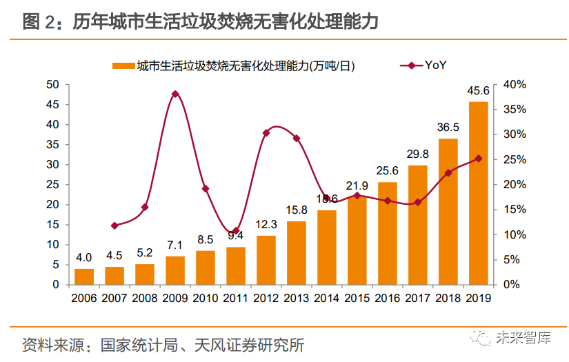 1.1. 新增產(chǎn)能增速放緩+垃圾分類推行,市場擔(dān)憂行業(yè)成長性近年來,我國垃圾焚燒發(fā)電產(chǎn)業(yè)步入快速發(fā)展軌道。以城市為例,生活垃圾焚燒處理廠由2006年69座增長至2019年389座,焚燒處理能力由2006年4.0萬噸/日上升至2019年45.6萬噸/日,提升約10倍。產(chǎn)能擴增帶動下,城市生活垃圾焚燒處置量由2006年0.11億噸提升至 2019 年 1.22 億噸,占無害化處置量的比例也由 2006 年 14%提升至 2019年51%。縣城垃圾焚燒產(chǎn)業(yè)也在積極推進,據(jù)住建部最新數(shù)據(jù),2018年縣城焚燒處置量占比達17%,較2006年提升16%。