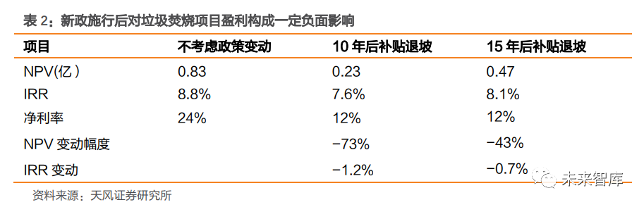 垃圾分類制度逐步推行,加劇市場憂慮。2019 年 4 月,《關(guān)于在全國地級及以上城市全面開展生活垃圾分類工作的通知》發(fā)布,全國地級及以上城市全面啟動生活垃圾分類工作。2020 年 12 月,住建部表示 46 個重點城市已基本建成生活垃圾分類系統(tǒng)。由于垃圾分類可將不同種類的生活垃圾,分別進行投放、收集、運輸直至處理處置,市場擔(dān)心隨著垃圾 分類制度進一步推行,濕垃圾、可回收垃圾等資源化利用量提高,生活垃圾焚燒處置量會 有所下滑。例如,上海在實行分類政策后,2019 年日均干垃圾處置量 17731 噸,較 2018 年底減少 17.5%。1.2. 國補靴子落地,垃圾焚燒企業(yè)盈利性短期承壓電價補貼是垃圾焚燒廠重要收入來源之一。為支持可再生能源,我國依據(jù)《可再生能源法》,對可再生能源采用固定電價政策,電價差異由國家專門設(shè)立的可再生能源電價附加補足。以垃圾焚燒發(fā)電項目為例,政策規(guī)定全國統(tǒng)一垃圾發(fā)電標桿電價0.65 元/Kwh,高出當(dāng)?shù)孛摿蛉济簷C組標桿上網(wǎng)電價(0.35 元/Kwh 左右)的部分,實行兩級分攤,當(dāng)?shù)厥〖夒娋W(wǎng)負擔(dān) 0.1 元/Kwh,其余由可再生能源電價附加解決。目前可再生能源補貼工作正有序推進, 包括垃圾發(fā)電項目在內(nèi)的存量生物質(zhì)項目正逐步納入補貼清單,2020 年新增生物質(zhì)項目清單也于 2020 年 11 月公布,共有 46 個新增垃圾發(fā)電項目納入 2020 年補貼清單,裝機規(guī)模 1163MW。國補靴子落地,將“合理利用小時數(shù)”作為補貼發(fā)放測算標準。2020 年 9 月,三部委發(fā)布《關(guān)于<關(guān)于促進非水可再生能源發(fā)電健康發(fā)展的若干意見>有關(guān)事項的補充通知》?!锻ㄖ反_定各類項目全生命周期合理利用小時數(shù),在合理利用小時的基礎(chǔ)上,項目全生命周期補貼電量=項目容量×項目全生命周期合理利用小時數(shù)。其中,項目容量按核準(備案)時確定的容量為準。如項目實際容量小于核準(備案)容量的,以實際容量為準。新政施行后對垃圾焚燒項目盈利構(gòu)成一定負面影響。我們對一個日處置量 1000 噸的垃圾焚燒項目進行了測算,新政施行后,假設(shè)在項目運營滿 15 年后,標桿上網(wǎng)電價按 0.45 元 /度確認,項目的 IRR/NPV 將分別減少 0.7%/43%;而對于優(yōu)質(zhì)的垃圾焚燒項目,其利用小時數(shù)較高,假設(shè)其運營 10 年后已滿足 82500 的全生命周期合理利用小時數(shù),從第 11 年 起,標桿上網(wǎng)電價按 0.45 元/度確認,則項目的 IRR/NPV 將分別減少 1.2%/73%。從凈利率的角度,按 0.45 元/度確認標桿上網(wǎng)電價后,項目凈利率將降低 12 %左右。