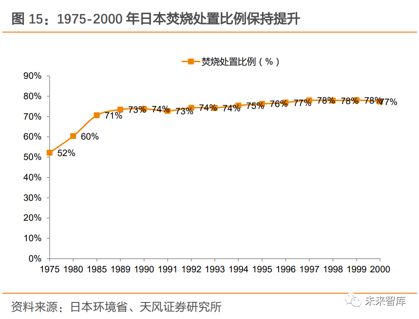 1.3. 補貼退坡已被市場消化,期待垃圾發(fā)電企業(yè)的破局之道補貼退坡影響已被市場消化,板塊估值處于歷史低位。近兩年,市場對垃圾焚燒補貼退坡的擔(dān)憂一直成為壓制板塊估值的重要因素之一,垃圾焚燒企業(yè)表現(xiàn)近年弱于市場。2020 年 9 月 29 日,《關(guān)于<關(guān)于促進非水可再生能源發(fā)電健康發(fā)展的若干意見>有關(guān)事項的補充通知》發(fā)布,更是加劇了市場對焚燒發(fā)電企業(yè)的盈利性和成長性的擔(dān)憂,造成短期板塊的明顯下挫。9 月 29 日至今,垃圾焚燒(長江)指數(shù)下降 12.3%;而同期上證綜指上漲 1.8%, 大幅跑輸市場 14.1 個百分點。從估值層面看,截至最新,我們選取的 8 家垃圾焚燒發(fā)電企業(yè),綜合市盈率 19 倍,處歷史低位。我們認為垃圾焚燒發(fā)電企業(yè)仍有成長及盈利優(yōu)化空間。我國垃圾焚燒企業(yè)運營收入包括上網(wǎng)電費收入及垃圾處理服務(wù)費收入,占比大致為 7:3。發(fā)電收入中,噸上網(wǎng)電量受入爐垃圾熱值、技術(shù)工藝、廠用電率等因素影響;上網(wǎng)電價受政策調(diào)控,由當(dāng)?shù)孛摿蛉济簷C組標 桿上網(wǎng)電價、省級電網(wǎng)負擔(dān)和國家可再生能源電價附加基金負擔(dān)三部分構(gòu)成。垃圾處置費根據(jù)噸垃圾處置單價(競標決定)和處理量確定,由項目所在地政府支付。本篇報告將從行業(yè)成長性(與焚燒處理量相關(guān)),以及垃圾發(fā)電企業(yè)盈利性(與企業(yè)財務(wù)狀況、噸上網(wǎng) 電量、噸垃圾處理費單價相關(guān))兩方面出發(fā),解析國補退坡及垃圾分類背景下,為何依舊 看好行業(yè)的發(fā)展前景。2. 成長性方面,國內(nèi)垃圾焚燒市場仍大有可為2.1. 復(fù)盤國外:焚燒處置量趨穩(wěn),分類制度并未產(chǎn)生明顯減量效果2.1.1. 日本:焚燒是垃圾處置主流方式,多年占比超 70%1980s 開始,日本大規(guī)模實施垃圾分類,并未造成焚燒處置量下降。1960s,在經(jīng)濟高速發(fā)展背景下,日本多個地區(qū)垃圾處置產(chǎn)能與處置需求間存在較大缺口,政府加大焚燒處置推進力度,垃圾焚燒產(chǎn)業(yè)得到快速擴張。1975 年-2000 年,日本垃圾焚燒處置比例由 52.20% 逐步提升至 77.40%,焚燒比例快速提升。這個過程伴隨著經(jīng)濟增長帶來的人均垃圾產(chǎn)量的持續(xù)增長,和垃圾分類從 1980s 開始大規(guī)模實施。事實上,1980-2000 年期間,日本垃圾分類造成的資源化比例提升,并未造成焚燒處置量的下降,焚燒量和焚燒處置比例持續(xù)保持正增長。