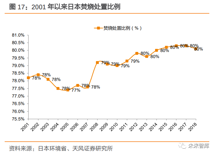 21 世紀以來,行業(yè)步入整合期,焚燒占比維持在高位。1997 年,受“二噁英事件”影響, 日本政府制訂了新的法律來規(guī)范二噁英排放,許多老焚燒廠被迫關(guān)停。政府也要求相鄰的市合作以提高垃圾管理水平,通過建造更大、更高效的焚燒爐減少二噁英排放。同時,政府相應(yīng)改變了國家補貼的發(fā)放門檻,只有大型的焚燒廠才能獲得補貼。在此背景下,日本垃圾焚燒廠經(jīng)歷了環(huán)保去產(chǎn)能及整合階段,焚燒處置量有所下滑,但焚燒占比始終處于高位,2012-2018 年維持在 80%。
