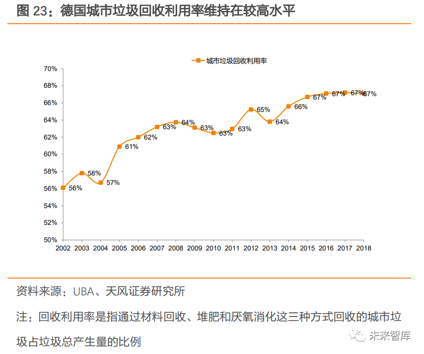 2.1.3. 德國:重視回收循環(huán),“零填埋”政策下焚燒量較穩(wěn)定德國較早開始實施垃圾分類,回收利用率較高。1992 年,德國在全國建立“綠點制”回收系統(tǒng),與各生產(chǎn)企業(yè)合作,將印有綠點標記的、具有再生價值的包裝物回收再利用。2011 年,已經(jīng)有 1.6 萬家德國包裝生產(chǎn)和使用企業(yè)加入了綠點系統(tǒng),超過 90%的商品外包裝印上了綠點標記。分類制度推行下,德國城市垃圾總產(chǎn)生量控制良好,由 2002 年的 5277 萬噸變動至 2018 年 5030 萬噸,城市垃圾回收利用率也從 2002 年 56%上升至 2018 年 67%。