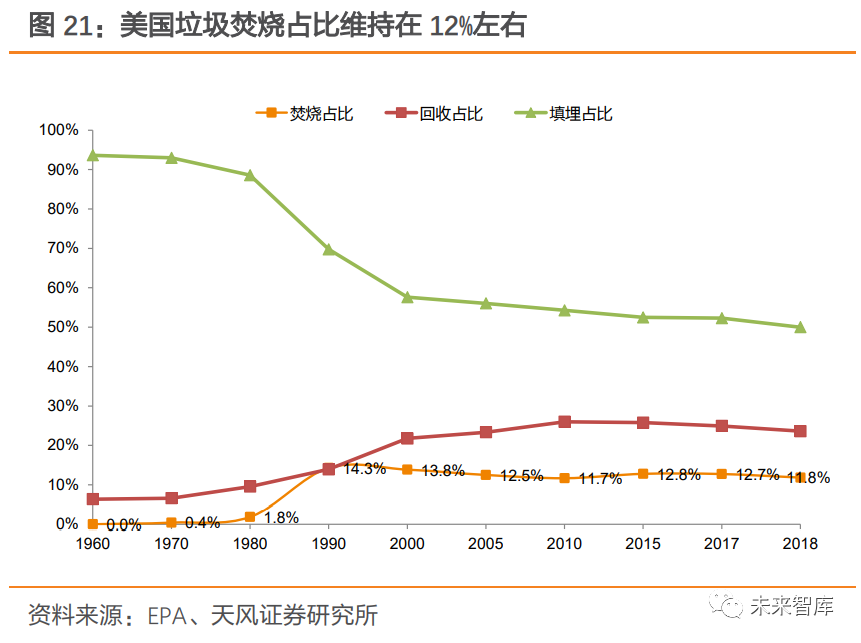 2.1.2. 美國:以填埋為主,焚燒占比維持在 12%左右美國垃圾產(chǎn)生總量及人均垃圾產(chǎn)量趨于平穩(wěn)。1990 年,美國開始建立資源垃圾分類回收系統(tǒng),人均垃圾產(chǎn)量在實行垃圾分類后開始逐步趨于穩(wěn)定,1990 年人均垃圾產(chǎn)量為 4.57 磅/ 每天,2018年為 4.9 磅/每天;垃圾產(chǎn)生總量則由 1990 年 208.3 百萬噸增加至 2018 年 292.4 百萬噸。