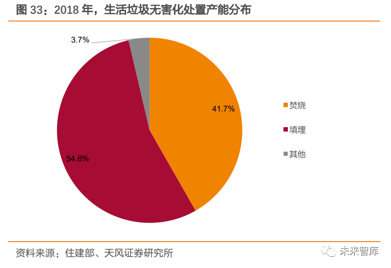 垃圾填埋是垃圾焚燒的最主要競爭工藝,近年來產(chǎn)能增速明顯放緩。生活垃圾無害化處置方式主要包括填埋、焚燒、堆肥等。2018 年,填埋和焚燒處置產(chǎn)能占無害化處置產(chǎn)能的比例分別為 54.6%、41.7%。填埋在早期因技術(shù)簡單、成本低等特點得到大規(guī)模應(yīng)用,但占地面積較大,與緊缺的土地資源天然具有對抗性,近年來產(chǎn)能增速明顯放緩;焚燒具有占地面積小、能源利用高等特點,對垃圾填埋的替代作用逐年顯現(xiàn),產(chǎn)能占比持續(xù)提升。