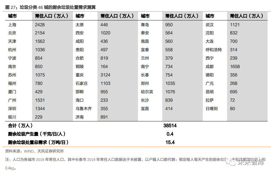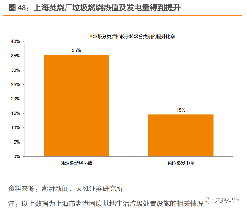 2.2. 展望國內(nèi):垃圾產(chǎn)量及焚燒占比仍處上升通道,焚燒需求將保持旺盛2.2.1. 垃圾分類減量化效果短期較難兌現(xiàn),廚余產(chǎn)能落地是關(guān)鍵影響因素從實際情況看,垃圾分類減量程度受廚余產(chǎn)能規(guī)模影響。由于有害垃圾占比很小,可回收垃圾在過去資源化利用率也較高,濕垃圾分出量對無害化處置總量影響較大。但在廚余處置產(chǎn)能不足情況下,從分揀前端分離出的濕垃圾,仍需通過焚燒等無害化處置方式進行最終解決,會削弱減量化效果。廚余產(chǎn)能缺口較大,許多城市推進垃圾分類工作時,仍面臨缺乏專業(yè)大型廚余垃圾處置設(shè)施這一難題。以濕垃圾末端處理設(shè)施建設(shè)進度較快的上海為例,截至 2020 年 6 月中旬, 濕垃圾分出量達 9632.13 噸/日,大于目前濕垃圾處置能力 5050 噸/日。據(jù)我們預(yù)測, 46 個垃圾分類重點城市,每日廚余垃圾(不含餐廚垃圾)處置需求達 15.4 萬噸。而據(jù) E20 公布,2019 年 5 月底,大規(guī)模廚余垃圾處理廠每日總處理能力合計僅為 0.6 萬噸。