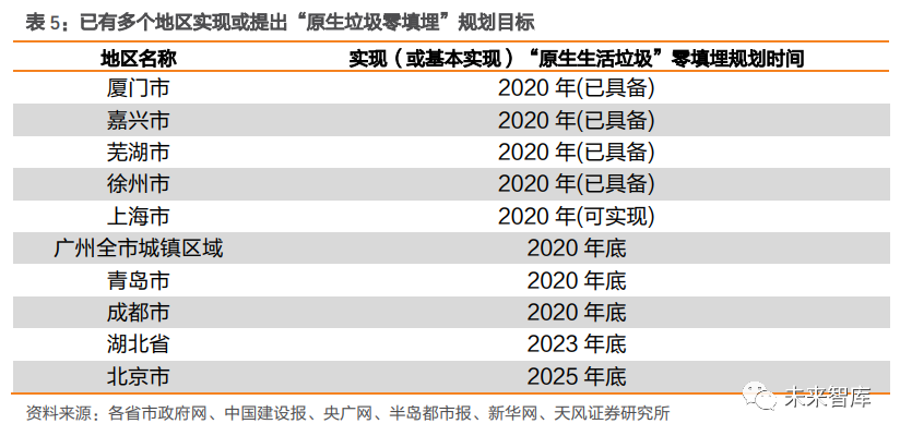 土地資源緊張+選址困難,填埋產(chǎn)能新增難度較大。一方面,我國土地資源較為緊張,城鎮(zhèn)化又進一步壓縮了城市公用設(shè)施用地的供給空間,垃圾填埋廠用地受限。另一方面,垃圾填埋場選址難度較大,需考量地質(zhì)、地形、水文、氣候、城市規(guī)劃、交通運輸?shù)雀黝愐蛩?,不符合《生活垃圾衛(wèi)生填埋處理技術(shù)規(guī)范》等相關(guān)規(guī)定中選址要求的填埋場,很可能無法滿足環(huán)評要求,填埋產(chǎn)能新增難度較大。環(huán)保治理力度加大+填埋場超負荷運行,垃圾填埋存量項目封場提速。非正規(guī)垃圾填埋場由于配套設(shè)施不健全、執(zhí)行標準缺失、不規(guī)范填埋作業(yè)等多種原因,對周邊環(huán)境存在著較為嚴重的污染隱患。隨著居民環(huán)保訴求提升以及政府層面環(huán)保治理力度加大,不符合環(huán)保要求的填埋場陸續(xù)被關(guān)停。我國在《“十二五”全國城鎮(zhèn)生活垃圾無害化處理設(shè)施建設(shè)規(guī)劃》首次提出存量垃圾治理,預(yù)計實施存量治理項目 1882 個,衛(wèi)生填埋場封場項目有 802 個。“十三五規(guī)劃”預(yù)計實施存量治理項目 803 個。此外,垃圾填埋場超負荷運轉(zhuǎn)現(xiàn)象突出,庫容趨飽和,加速封場進程。由于近些年垃圾產(chǎn)量增速較高,以及部分地區(qū)焚燒設(shè)施尚在規(guī)劃建設(shè)中,垃圾填埋場超負荷運轉(zhuǎn)現(xiàn)象突出, 庫容加速飽和,需提前封場。以 2020 年 2 月封場的西安市江村溝垃圾填埋場為例,作為曾經(jīng)國內(nèi)以及亞洲最大的垃圾填埋場,其設(shè)計日處理量 2600 噸。但隨著城市發(fā)展以及人口快速增長,垃圾處理量已由建成之初的 800 噸/日上升至 2019 年 10000 噸/日左右,超負荷運轉(zhuǎn)下提前 20 年迎來飽和。垃圾填埋“新增難+存量減”背景下,垃圾焚燒替代屬性凸顯,產(chǎn)能占比有望進一步提升。 垃圾焚燒作為垃圾填埋的最主要替代方式,具有占地面積小、處理效率高、環(huán)境污染小、 能源利用高等多方面優(yōu)勢。2020 年 8 月,國家發(fā)展改革委、住房城鄉(xiāng)建設(shè)部和生態(tài)環(huán)境部 等三部委聯(lián)合印發(fā)《城鎮(zhèn)生活垃圾分類和處理設(shè)施補短板強弱項實施方案》,明確提出“原 則上地級以上城市以及具備焚燒處理能力的縣(市、區(qū)),不再新建原生生活垃圾填埋場, 現(xiàn)有生活垃圾填埋場主要作為垃圾無害化處理的應(yīng)急保障設(shè)施使用?!苯刂聊壳?,已有多個省市提出“原生生活垃圾零填埋”的規(guī)劃目標,垃圾焚燒替代屬性凸顯。