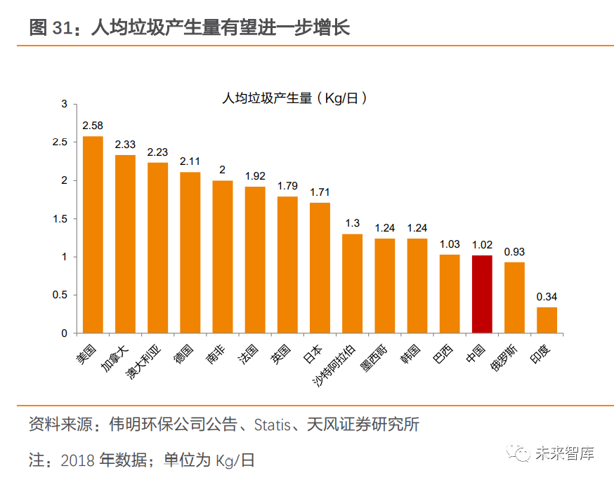 初始投資大+建設(shè)周期長,補齊廚余產(chǎn)能缺口仍需時間,短期來看垃圾分類“量減”影響有限。據(jù) E20 統(tǒng)計,2020 年上半年,餐廚/廚余處理處置項目共計成交 39 個,成交數(shù)量僅次于垃圾焚燒板塊,占固廢市場總成交項目個數(shù)比例超 35%。目前各地正加快推進廚余設(shè)施建設(shè),但廚余處置項目前期投資較大,且從規(guī)劃、建設(shè)到實際投運的周期也較長,補齊 產(chǎn)能缺口仍需時間。在現(xiàn)階段廚余產(chǎn)能與垃圾分類制度推行不匹配情況下,預(yù)計垃圾分類帶來的“量減”影響有限。2.2.2. 總量增+焚燒占比提升,需求仍將保持旺盛隨著城鎮(zhèn)化穩(wěn)步推進,我國人均垃圾產(chǎn)量及垃圾總產(chǎn)生量有望繼續(xù)增長。根據(jù)世界銀行的數(shù)據(jù),城鎮(zhèn)化率提升和人均垃圾產(chǎn)生量有一定正相關(guān)性。近年來,我國城鎮(zhèn)化進程加速推進,2019 年底城鎮(zhèn)化率已達 61%,但仍低于國外發(fā)達國家(如美國、日本 2018 年城鎮(zhèn)化 率分別為 82.3%、91.6%)。且我國人均垃圾產(chǎn)生量也較低,據(jù) Statista 數(shù)據(jù)顯示,2018 年我國人均垃圾產(chǎn)生量 1.02Kg/日,而同期的美國、加拿大、澳大利亞等地區(qū)的人均垃圾產(chǎn)生量均超過 2kg/日。展望未來,隨著城鎮(zhèn)化進一步推進,人均垃圾產(chǎn)生量有望進一步提升,疊加人口增速共同帶動生活垃圾產(chǎn)生量繼續(xù)增長,對垃圾處置需求構(gòu)成有力支撐。