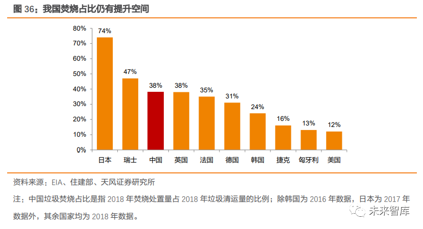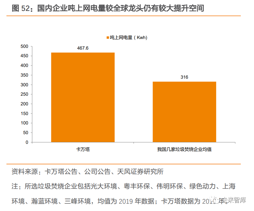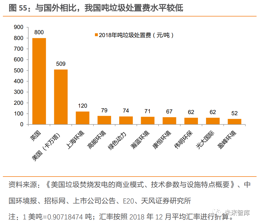 相較于流化床技術(shù),爐排爐技術(shù)因垃圾瀝水量較多、鍋爐效率較高等原因,具有更高的噸上網(wǎng)量,從而帶動垃圾焚燒發(fā)電企業(yè)盈利能力提升。中溫次高壓技術(shù)逐步得到推廣。在過去,受限于生活垃圾的復(fù)雜性以及焚燒發(fā)電技術(shù)處理水平有限,國內(nèi)垃圾焚燒電廠基本采用中溫中壓蒸汽參數(shù)來防止過熱器等受熱面管高溫腐蝕。但據(jù)《生活垃圾焚燒廠噸垃圾發(fā)電量的研究分析》研究表明,垃圾熱值相近的情況下, 使用中溫次高壓參數(shù)時發(fā)電量更高。隨著我國垃圾分類的推進及焚燒發(fā)電技術(shù)日益成熟, 部分焚燒廠率先使用中溫次高壓技術(shù)來提高發(fā)電效率。例如在 2009 年,深能源投資的武漢市江北西部垃圾焚燒廠、福建創(chuàng)冠投資的湖北黃石垃圾焚燒發(fā)電廠、在建的北京廊坊垃圾焚燒發(fā)電項目等先后采用中溫次高壓技術(shù),在國內(nèi)掀起應(yīng)用熱潮,中溫次高壓技術(shù)也逐步得到推廣,進一步提升噸發(fā)電量。3.2.3. 噸發(fā)電量較國外仍有較大提升空間我國噸發(fā)電量較發(fā)達國家仍有差距,未來提升空間較大。深圳市生活垃圾處理監(jiān)管中心發(fā)布的文章顯示,美國生活垃圾熱值可達到我國目前平均水平的兩倍,美國生活垃圾焚燒噸發(fā)電量也在 600kWh 以上,表明我國生活垃圾熱值及噸發(fā)電量仍有較大提升空間。展望未來,垃圾分類制度仍在持續(xù)推進,焚燒企業(yè)的處理工藝仍在不斷優(yōu)化,噸發(fā)電量提升未來可期,垃圾焚燒企業(yè)盈利能力有望得到持續(xù)優(yōu)化。