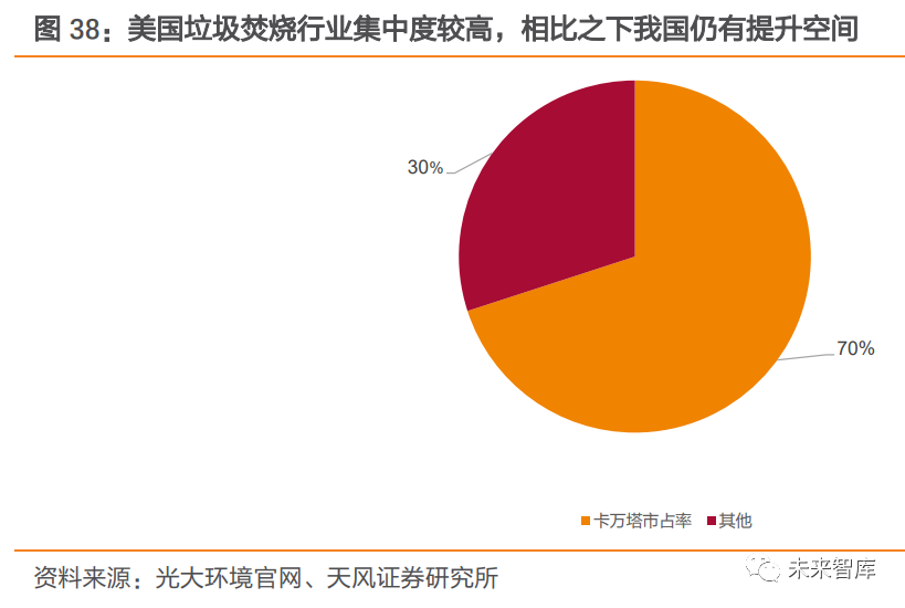 行業(yè)集中度較國外發(fā)達國家仍有差距,未來有望進一步提升。據(jù)卡萬塔公司總裁 2019 年 10 月發(fā)言介紹,卡萬塔在美國市場的占有率已接近 70%。相比之下,我國垃圾焚燒行業(yè)龍頭企業(yè)市占率仍較低,未來有望通過并購整合,繼續(xù)擴大市場規(guī)模,行業(yè)集中度或?qū)⑦M一步提高。