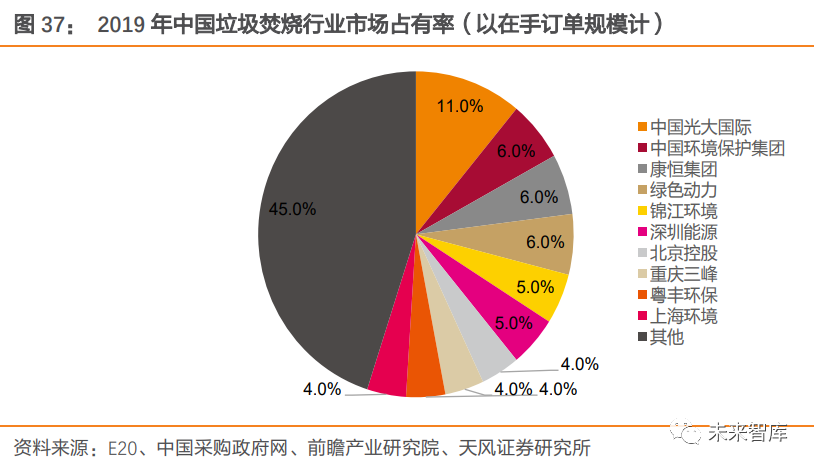 預(yù)計到 2025 年,我國生活垃圾焚燒無害化處理能力將達 100 萬噸/日,較 2018 年新增產(chǎn)能 59 萬噸/日。2.3. 國內(nèi)行業(yè)集中度提升+海外市場拓展,龍頭增速有望高于行業(yè)垃圾焚燒企業(yè)加速“跑馬圈地”,在手訂單規(guī)模不斷擴大。前些年在一系列政策大力支持下,各城市競相建立垃圾焚燒發(fā)電廠,并在國內(nèi)掀起投資并購浪潮。行業(yè)外企業(yè)通過并購快速切入垃圾焚燒領(lǐng)域,行業(yè)內(nèi)企業(yè)借助并購迅速擴大自身規(guī)模。例如,2011 年,水務(wù)領(lǐng)域龍頭首創(chuàng)股份通過收購新環(huán)保能源,將業(yè)務(wù)拓展至固廢處理領(lǐng)域;2013 年,瀚藍環(huán)境收購創(chuàng)冠環(huán)保(中國)有限公司 100%股權(quán),垃圾規(guī)劃處理能力一年內(nèi)提升四倍。并購趨勢下,龍頭企業(yè)在手規(guī)模不斷擴大,截至 2019 年,在手訂單規(guī)模前十企業(yè)市占率達 55%,前三占有率分別為 11/6/6%。