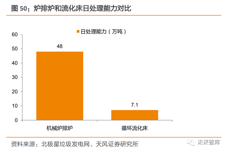 3.2.2. 噸發(fā)電量提升原因二:技術(shù)工藝優(yōu)化爐排爐已成為成熟的技術(shù)路線。垃圾焚燒技術(shù)主要包括流化床焚燒和爐排爐焚燒。在行業(yè)發(fā)展初期,由于國外引進的爐排爐焚燒技術(shù)存在不適應(yīng)性以及成本高昂等問題,國內(nèi)自主研發(fā)的流化床焚燒技術(shù)應(yīng)用較多。隨著國產(chǎn)化爐排爐技術(shù)發(fā)展,以及流化床技術(shù)“多飛灰” 不足的凸顯,爐排爐技術(shù)逐漸取代流化床技術(shù),得到快速發(fā)展。從現(xiàn)有爐型分布上看,2020 年,全國已運行垃圾焚燒廠 492 座,涉及 1202 臺焚燒爐,其中,機械爐排爐臺數(shù)占比超過 86%,循環(huán)流化床臺數(shù)占比不到 14%;從處置量來看,全國機械爐排爐日合計處理能力超過 48 萬噸,循環(huán)流化床日合計處理能力僅為 7 萬 1 千噸左 右。