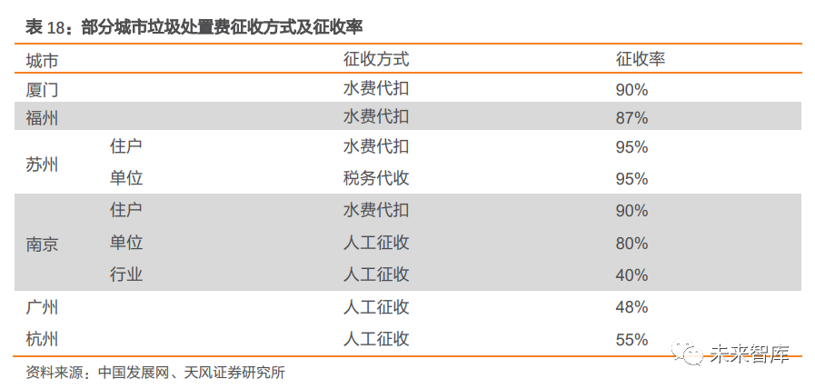 噸發(fā)電量提升30-54 度/噸(提升 10-18%),可對沖政策負向影響。對一個日處置量 1000 噸的垃圾焚燒項目進行測算,假設(shè)在項目補貼結(jié)束后,標桿上網(wǎng)電價按 0.45 元/度確認;在技術(shù)提升所帶來的不同上網(wǎng)電量情景假定下,我們發(fā)現(xiàn),假定其他條件不變,補貼 15 年后退坡,若項目噸發(fā)電量較測算基準(300 度/噸)提升 30 度/噸(提升 10%),將能維持項目的 IRR 不變(8.8%)。補貼 10 年后退坡,若項目噸發(fā)電量較測算基準提升 54 度/ 噸(提升 18%),項目的 IRR 也能保持不變。3.3. 收費制度逐步完善,垃圾處置費有望上調(diào)3.3.1. 國內(nèi)以定額征收為主,財政補貼缺口較大垃圾處置收費制度主要包括定額征收及計量征收。定額征收主要指以家庭住戶或者個人作為收費單位,不論垃圾排放量的多少,一律按照當(dāng)?shù)卣_定的繳費標準進行繳費,收費標準較低。計量征收包括按指定垃圾桶數(shù)征收、按垃圾重量征收和按垃圾袋數(shù)量征收等, 與垃圾產(chǎn)生量直接掛鉤。1991 年,我國開始提出對城市垃圾處置實行服務(wù)性收費制度,并于 2018 年首次提出 “按量收費”經(jīng)濟政策。以 2002 年 6 月國家發(fā)改委等部委聯(lián)合頒布《關(guān)于實行城市生活垃圾處理收費制度促進垃圾處理產(chǎn)業(yè)化的通知》 為時間節(jié)點, 我國正式開征城市生活垃圾處置費。自 2011 年起, 一些城市政府高度重視垃圾分類, “按量收費”政策在北京與廣州兩個 城市先后醞釀并試點。2018 年 6 月,國家發(fā)改委發(fā)布《關(guān)于創(chuàng)新和完善促進綠色發(fā)展價格機制的意見》,提出 2020 年底前,全國城市及建制鎮(zhèn)全面建立生活垃圾處理收費制度, 同時首次明確提出 “按量收費”的經(jīng)濟政策,嘗試以經(jīng)濟激勵改變行為人的垃圾處置行 為。居民端收費以定額為主,非居民端實現(xiàn)計量征收。①收費標準:據(jù)國家發(fā)改委的數(shù)據(jù),除沈陽、寧波和上海外,33 個城市制定了居民生活垃圾處置費收費標準,其中,長沙、海口 和烏魯木齊為水消費系數(shù)法隨水計征,深圳為按排污水量計征,其他 28 個城市為按戶或按人計征。除沈陽外,35 個城市制定了非居民生活垃圾處理收費標準。②收費方式:主要 是上門收取和委托代收,采取委托代收的,一般為委托居委會、物業(yè)公司代收,委托稅務(wù)、 工商、財政等部門代收代繳,或與水費、燃氣費等公用事業(yè)費用聯(lián)合收取等。