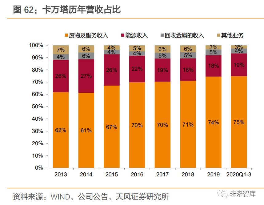 垃圾處置費由“污染”主體承擔(dān),市場化程度較高。美國垃圾處置費按照“誰污染、誰付費”的原則,由當(dāng)?shù)卣蚴者\企業(yè)向居民(企業(yè))收取,再支付給焚燒廠業(yè)主或運營商, 每噸垃圾處置費在 50-70 美元之間居多。市場化機制下,垃圾處置費成為垃圾焚燒廠收入 的最主要來源。美國焚燒企業(yè)垃圾處置費占總運營收入的比例平均值約 70%,以卡萬塔為例,垃圾處置費收入占比常年高于 60%,2020Q1-3 垃圾處置費收入占比達 75%。