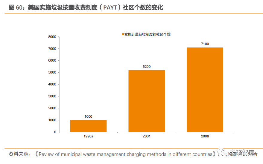 日本多采用單一計量收費制。在日本,常見的垃圾收費類型有單一計量收費制、累進計量收費制、定量免費制、補助組合收費制和定額收費制 5 種。據(jù)山谷修作的調(diào)查統(tǒng)計,截至2015 年 4 月,日本全國 457 個實行垃圾收費的城市中,有 430 個城市采用單一計量收費制,所占比率為 94%。在采用單一計量收費制的城市中,單個垃圾袋價格(通常為 40~50L 的大袋)以 30-50 日元(1.92-3.20 人民幣)居多。日本垃圾處理廠建設(shè)資金及運營費用由財政承擔(dān),財政支出負擔(dān)加大對垃圾有償收費制度的實施有推動作用。隨著日本垃圾處置費用隨處置量與日俱增,財政支出負擔(dān)加大。例如 北九州市的日明凈工廠,在該地區(qū)未實施垃圾收費制度時,2008 年運營收入不及費用支出的一半,剩余的運營費用缺口部分需要依靠財政補貼。據(jù)《日本垃圾處理:政策演進、影響因素與成功經(jīng)驗》文中介紹,為了緩解財政支出壓力,日本實施生活垃圾有償收費制度的市町村有所上升,以滿足垃圾處置資金需求,體現(xiàn)出財政支出壓力對垃圾收費制度的推 動作用。(2)美國:以計量收費制為主,垃圾處置費由“污染”主體承擔(dān)美國較早推行計量收費制。1980s 起,計量收費制在美國多個地區(qū)興起。到 2008 年,美國已有 7100 個社區(qū),通過計量收費的方式向 7500 萬人征收垃圾處置費,約占總?cè)丝诘?25%。其采取的計量方式大多是隨垃圾桶或者垃圾袋、垃圾標簽征收。以馬薩諸塞州的阿特爾伯勒為例,該地于 2005 年起實施計量收費制度,居民每月需繳納 15 美元,每周可處理 36 加侖以內(nèi)的垃圾,超過則需另外購買購物袋(7.2 加侖的購物袋需支付 1.5 美元)。