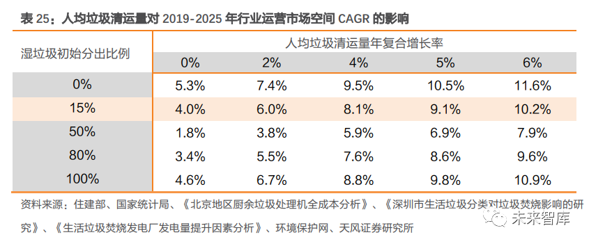 3.3.3. 我國垃圾收費政策細則有望逐步完善,處置費有望上調(diào)從國外實踐看,計量收費制度下征收水平較高,能為垃圾焚燒廠處置費收入提供更為充足的資金保障,但是否實施計量收費制仍需衡量多方利益。一方面,制定計量收費制度需要 更多政策的制定和執(zhí)行成本;另一方面,實施計量制度還需要用于計量的運輸設(shè)備、健全的垃圾回收機制等。據(jù)《關(guān)于城市生活垃圾不同收費制度的思考》文中分析,我國大部分城市未采用計量收費制度的原因,除了更多的交易費用外,還包括居民責(zé)任意識不強、回收機制不完全等,且這一制度有可能導(dǎo)致非法傾倒、私自焚燒垃圾等現(xiàn)象。國內(nèi)政策環(huán)境逐步成熟,征收方式有望向計量轉(zhuǎn)變,垃圾處置費或?qū)⑸险{(diào)。從全球?qū)嵺`看, 人均 GDP 水平較高、回收體系較健全的發(fā)達國家更多采用計量收費政策。我國人均 GDP 水平正在穩(wěn)步上升,加之垃圾分類、回收體系的不斷健全以及居民環(huán)境意識的逐步增強, 垃圾收費制度有望向計量征收轉(zhuǎn)變。此外,隨著人工費用、燃油和材料等價格上漲,定價部門預(yù)計將按實際情況細化收費項目,調(diào)整收費項目和費率,垃圾焚燒企業(yè)垃圾處置費也有望上調(diào)。垃圾處置單價上調(diào) 22%-39%可對沖政策負向影響。國補退坡政策施行后,若想維持項目盈利能力不變,垃圾焚燒企業(yè)可與地方政府協(xié)調(diào),爭取上調(diào)垃圾處置費,從而確保項目的盈利能力和收入水平。據(jù)我們測算,在補貼 15 年后退坡的假設(shè)下,為維持項目 IRR 不變,政府的垃圾處理單價應(yīng)該從 60 元/噸上調(diào)至 73 元/噸,上調(diào)幅度 22%;10 年后退坡,則應(yīng)上調(diào)至 83 元/噸,上調(diào)幅度 39%。4. 綜合成長及盈利性因素,垃圾焚燒運營收入仍有增長空間垃圾分類會帶來“量減”和“熱值提升”雙向影響。垃圾分類一方面會通過提高資源化處置量,影響焚燒處置量;另一方面也通過降低生活垃圾中濕垃圾占比,帶動入爐垃圾熱值提升,使得噸發(fā)電量同步提升。綜合考慮垃圾分類帶來的“量減”+“熱值升”,以及城鎮(zhèn)化率提升、技術(shù)工藝優(yōu)化等影響因素,據(jù)我們測算,2019-2025 年垃圾焚燒行業(yè)運營收入 GAGR 約 7%,垃圾分類減量化影響下仍有增長空間。①生活垃圾各成分占比:假定濕垃圾、可回收垃圾及干垃圾占比分別為 55%、10%、35%。由于有害垃圾占比很小,暫不考慮有害垃圾的影響。②分出比例:假定濕垃圾與可回收垃圾的分出比例相同,2019 年設(shè)定為 15%,隨著分類體 系的健全,逐年提升 10%。③濕垃圾回收處置率:假定 2019 年濕垃圾回收處置率 40%,并隨著廚余處置產(chǎn)能擴增,逐年提升 10%。④殘渣占比:由于濕垃圾資源化處置后的廢渣仍需通過焚燒進行最終處置,假定殘渣占比 20%。⑤由垃圾分類導(dǎo)致的噸發(fā)提升量:據(jù)《深圳市生活垃圾分類對垃圾焚燒影響的研究》相關(guān)內(nèi)容,我們推算出當(dāng)濕垃圾在入爐垃圾中的占比降低 1% 時,噸垃圾發(fā)電量可以提升 2.2-3.0Kwh,保守假定濕垃圾占比下降 1%會帶來噸發(fā)電量提升 2.2Kwh。⑥由技術(shù)工藝優(yōu)化導(dǎo)致的噸發(fā)提升量:據(jù)《生活垃圾焚燒發(fā)電廠發(fā)電量提升因素分析》介紹,李坑一廠借助中溫超高壓技術(shù),噸垃圾發(fā)電量達 350~360kWh,以及在垃圾熱值相近 的情況下,中溫次高壓余熱鍋爐發(fā)電量增加 17%。我們假定技術(shù)優(yōu)化帶來噸發(fā)電量提升50Kwh,由2019年300Kwh線性提升至2025年350Kwh。⑦噸垃圾處置費及年復(fù)合增長率:假定 2019 年噸垃圾處置費單價 70 元,未來每年按 CPI 增速 3%增長。城鎮(zhèn)化率提升+人均垃圾清運量提升+技術(shù)優(yōu)化三道屏障,可對沖垃圾分類減量影響,運營總收入市場空間有望保持增長。若從靜態(tài)時點單獨分析垃圾分類對焚燒量的影響,在 2019 年數(shù)據(jù)及相關(guān)假設(shè)的基礎(chǔ)上,相較于垃圾分類前,隨著濕垃圾分出比例提升,焚燒處置量下滑程度加大。但從長期動態(tài)視角看,在城鎮(zhèn)化率、人均垃圾清運量、焚燒占比共同提升趨勢下,焚燒需求仍將保持旺盛,疊加垃圾分類及技術(shù)進步驅(qū)動下的噸上網(wǎng)電量提升,垃圾焚燒廠運營收入市場空間有望保持正增長。