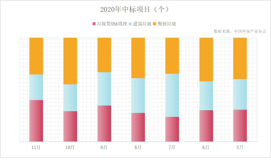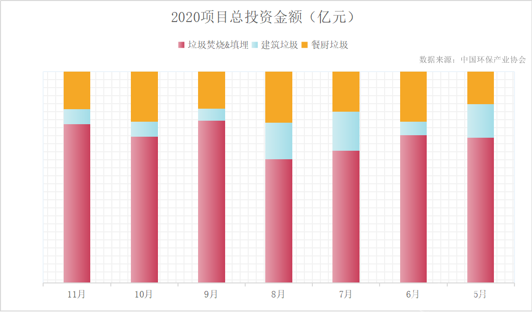 應開展信息發(fā)布工作的環(huán)境保護重點城市和環(huán)境保護模范城市均已按照規(guī)定發(fā)布信息,統(tǒng)計數(shù)據(jù)差異源于自愿開展信息發(fā)布工作的城市數(shù)量。再來看2020年前11個月的細分領(lǐng)域數(shù)據(jù)——2020年前11個月,全國垃圾焚燒中標項目共計311項,總投資金額共計655.15億元;餐廚垃圾處理處置中標項目共計361項,總投資金額194.6億元;2020年5月到11月,全國建筑垃圾處理處置中標項目共計213項,總投資金額61.85億元。從中標項目數(shù)量來看,垃圾焚燒和填埋、建筑垃圾、餐廚垃圾處理處置項目各有千秋,但是從總投資金額,以及單個項目平均投資金額來看,垃圾焚燒&填埋顯然遠超后兩者。相較之下,建筑垃圾處理處置項目波動較大,餐廚垃圾處理處置項目中標情況則較為平穩(wěn)。十九屆五中全會通過的《中共中央關(guān)于制定國民經(jīng)濟和社會發(fā)展第十四個五年規(guī)劃和二〇三五年遠景目標的建議》明確指出,到2035年,廣泛形成綠色生產(chǎn)生活方式,碳排放達峰后穩(wěn)中有降,生態(tài)環(huán)境根本好轉(zhuǎn),美麗中國建設目標基本實現(xiàn)。