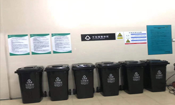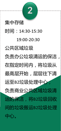 樓層公共區(qū)域的保潔工作人員負責(zé)垃圾初步分類,分類垃圾桶內(nèi)的垃圾袋按顏色區(qū)分,在垃圾分好類并用袋裝密封后,將由專人從上至下層層收集并運輸,減少貨梯使用時間,提高垃圾運輸效率。