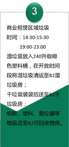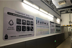 上海中心大廈對B2垃圾房(地下2層)進行改造,改造后的垃圾房針對不同垃圾進行分區(qū)管理,并添加了垃圾分類相關(guān)的宣傳海報及公示欄。結(jié)合BOMA(中國)標(biāo)準將管理文件、警示標(biāo)志,以及清潔消毒藥劑MSDS張貼上墻,引導(dǎo)白領(lǐng)、租戶正確投放垃圾。