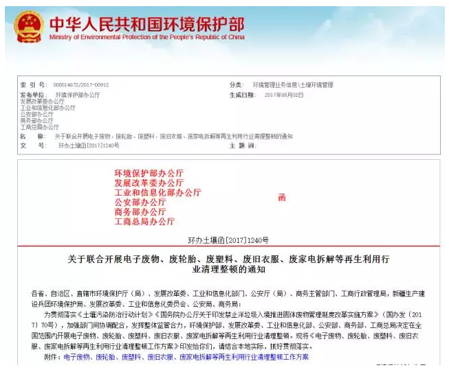 為貫徹落實(shí)《土壤污染防治行動(dòng)計(jì)劃》《國務(wù)院辦公廳關(guān)于印發(fā)禁止洋垃圾入境推進(jìn)固體廢物管理制度改革實(shí)施方案》(國辦發(fā)〔2017〕70號(hào)),環(huán)境保護(hù)部聯(lián)合發(fā)展改革委、工業(yè)和信息化部、公安部、商務(wù)部、工商總局開展電子廢物、廢輪胎、廢塑料、廢舊衣服、廢家電拆解等再生利用行業(yè)清理整頓。