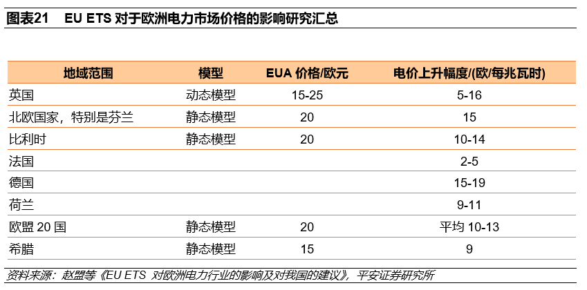 對企業(yè)業(yè)績而言,碳價格可通過企業(yè)出售過量碳排放配額、增加企業(yè)碳成本或轉(zhuǎn)嫁成本導(dǎo)致產(chǎn)品價格上升等影響企業(yè)業(yè)績,EU ETS的第一階段到第三階段的電力行業(yè)獲得意外暴利,這也主要取決于電廠機組新能源占比。