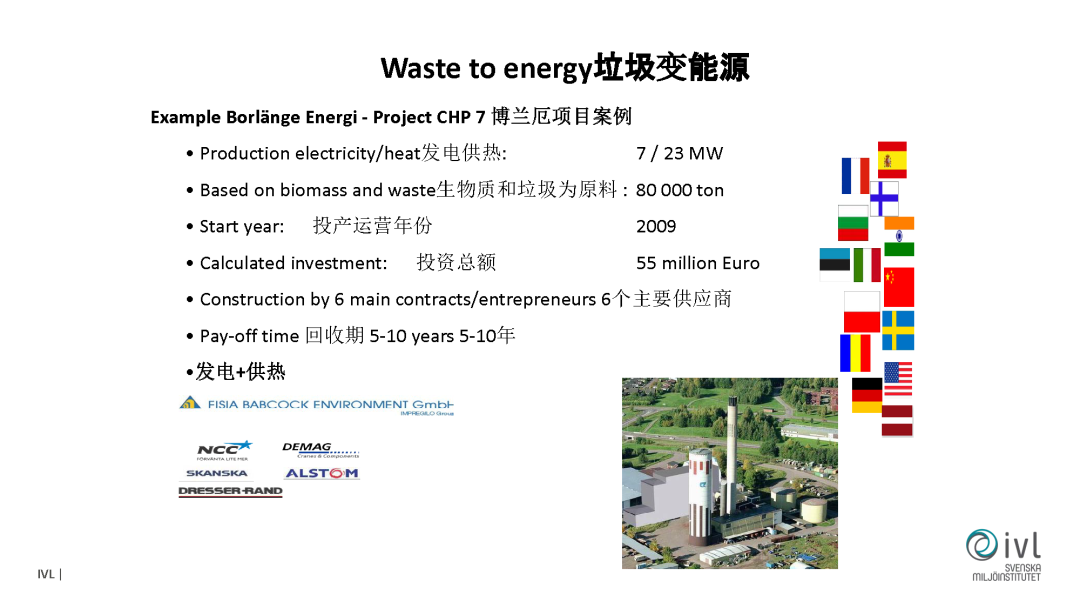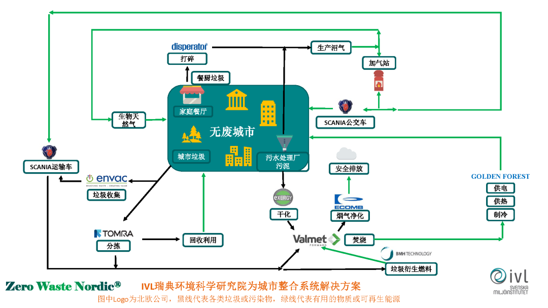 這是我們初步的聯(lián)盟的解決方案,目前我們所含的無廢城市的解決方案包括餐廳的餐廚垃圾,餐廚垃圾我們有一間公司可以做很智能化的破碎和收集,收集起來不是像過去國內(nèi)在提的有爭議的,進入到下水道,我們彌補的經(jīng)過一個容器把它收集起來,把它做沼氣。沼氣提純以后,可以用到這家公司的公交車里,也是很知名的一家北歐的供應(yīng)商。提純以后,可以作為可再生的天然氣回到城市里進行回收和使用。同時可以用在環(huán)衛(wèi)的垃圾運輸車里,開始常老師講到環(huán)衛(wèi)車怎么更加清潔,這也是一個比較好的做法。普通的生活垃圾,這里面有一家瑞典公司是做智能化收集的,是把垃圾像收污水一樣收垃圾,垃圾不是投到垃圾桶,而是直接掉到地下的管廊里,它有高速的風(fēng),可以快速的把它運輸?shù)嚼修D(zhuǎn)站,在地上看不到垃圾和垃圾桶。回收以后,這家公司可以做一個很智能化的分揀,它是全球很知名的一家做自動化分選的公司。可以把很有價值的東西回收回來,沒有價值的東西進一步去做能源回收。能源回收這一塊,這里有一家芬蘭公司是做垃圾焚燒做得比較好的,叫韋美德(音),焚燒以后,它的煙氣做到凈化,有一家公司是做煙氣凈化的。焚燒所產(chǎn)生的熱量由這家公司去設(shè)計,給城市供熱供冷、供電。還有一家芬蘭公司做垃圾衍生原料,垃圾處理以后,讓垃圾焚燒會更加便利。