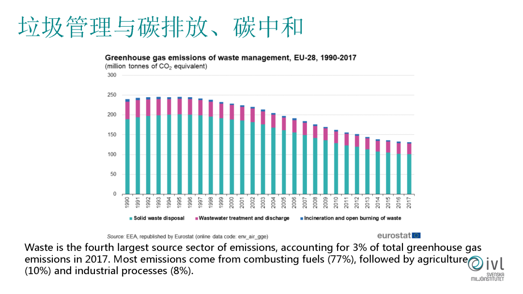 回到垃圾管理和碳排放、碳中和這個主題,我這邊做了一些調(diào)研,這是歐盟的一個數(shù)據(jù),它統(tǒng)計了在廢物處理行業(yè)內(nèi)它的溫室氣體排放。根據(jù)這個統(tǒng)計,我們發(fā)現(xiàn)我們廢物處理這個行業(yè)是整個社會第四大的溫室氣體排放,雖然它的比例不高,只有3%,但是它的排名是比較靠前的。別看我們這個行業(yè)不是很大,但是我們對碳排放和碳中和的貢獻也是不可小看的。
