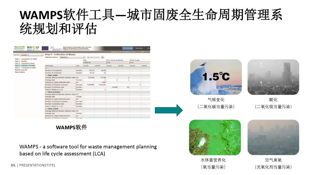 為什么說我們在前面有一個五階梯的概念,我們想讓垃圾管理盡量避免產(chǎn)生,這樣的話,對碳排放和碳中和是更加有效的。這個計算是很復(fù)雜的,是基于我們自己的軟件工具。對城市的垃圾管理有一個全生命周期的管理和系統(tǒng),可以從垃圾成分分析到垃圾收集、轉(zhuǎn)運、分類到終端的處理,整個全生命周期我們要算一下它的環(huán)境影響,我們算的一個是二氧化碳它的排放,另外包括酸雨酸化的影響,包括對水體富營養(yǎng)化的影響,包括對空氣臭氧的影響,我們用工具算一下,通過這樣的計算方法可以比較出來哪一種垃圾管理的方法對城市來說它的全生命周期的環(huán)境影響最小。