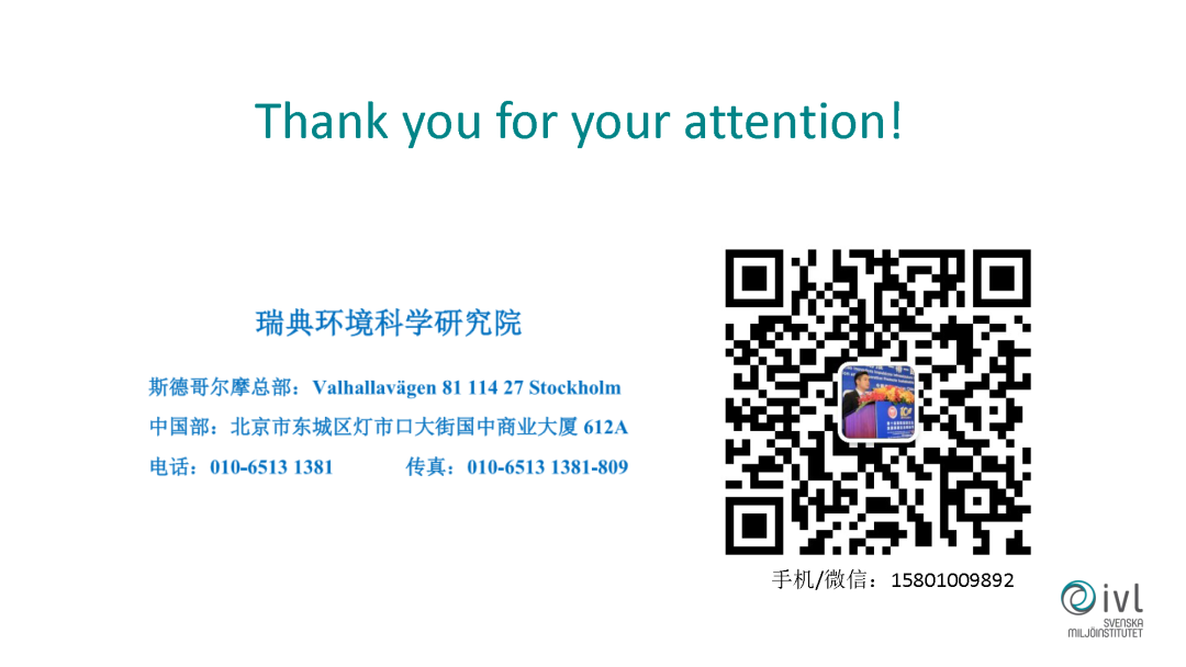 最后跟大家分享一個平臺,瑞典政府現(xiàn)在打造的一個叫智慧城市瑞典的技術(shù)出口和投資平臺。瑞典環(huán)科院有一半是瑞典政府的股份,所以我們在做自己的研究科研以外,我們也幫瑞典的政府做很多服務(wù)。這是瑞典政府投資的一個平臺,他的目的是把瑞典更多的技術(shù)方案、技術(shù)公司向全球推廣。我們在中國的辦公室除了做研究和咨詢以外,也提供這方面的職能。目前這個平臺有一千多家的清潔環(huán)保公司,如果我們存在哪些環(huán)境問題,或者對哪些技術(shù)有需求,可以跟我們?nèi)〉靡恍┞?lián)系。我們可以協(xié)調(diào)組織一些線上的或者線下的交流會,和瑞典那邊做一些互動,促進中國和瑞典在節(jié)能環(huán)保領(lǐng)域的合作。