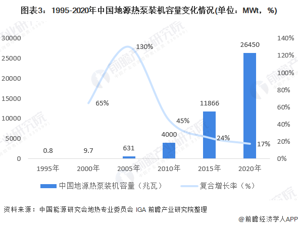 從裝機容量占全球總量的比重看,國內(nèi)地源熱泵裝機容量占比已從1995年的0.04%上升到2015年的23.61%,2020年國內(nèi)地源熱泵裝機容量占全球的比重上升到34.11%,且增長速度持續(xù)加快。