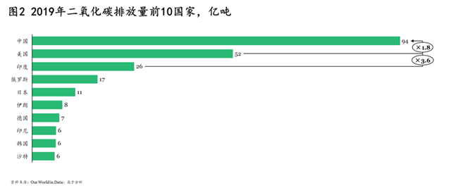 我國(guó)于2007年超過美國(guó),成為二氧化碳排放第一大國(guó),2019年二氧化碳排放量94億噸,遠(yuǎn)高于同期美國(guó)的52億噸和印度的26億噸(如圖2)。