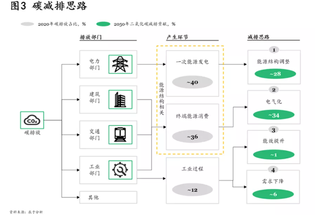 僅靠能源結(jié)構(gòu)調(diào)整、電氣化等主要脫碳手段顯然無(wú)法完成任務(wù)。當(dāng)前,我國(guó)的碳排放主要來(lái)自電力、建筑、交通、工業(yè)四大部門,二氧化碳的產(chǎn)生來(lái)自一次能源的使用及工業(yè)生產(chǎn)過程(如圖2)。針對(duì)各產(chǎn)生環(huán)節(jié),有四大減排思路: