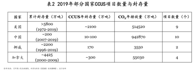 當(dāng)前,我國(guó)每年CCUS封存量?jī)H為10——100萬(wàn)噸,遠(yuǎn)低于美國(guó)每年的2100萬(wàn)噸。截至2019年底,我國(guó)二氧化碳累積封存量200萬(wàn)噸,遠(yuǎn)低于美國(guó)的5800萬(wàn)噸(見表2)。