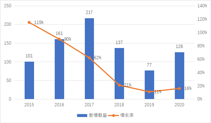 圖1 綠色基金新增數(shù)量及增長(zhǎng)率(2015-2020年)