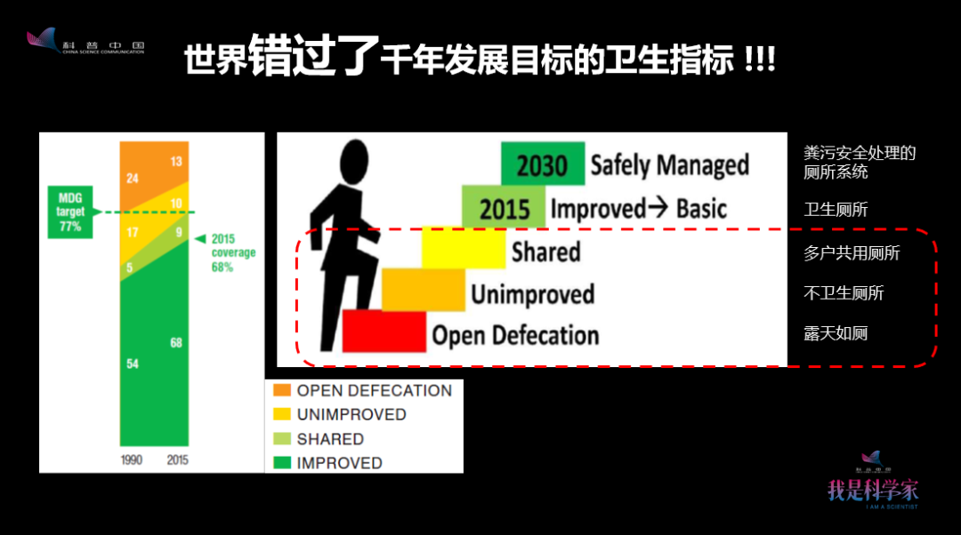 盡管在實(shí)現(xiàn)這個(gè)千年發(fā)展目標(biāo)的進(jìn)程中,最終的目標(biāo)沒有實(shí)現(xiàn),但是廁所的覆蓋率還在逐漸增加。反映到兒童死亡率上,即是死亡率的逐年下降。這是一個(gè)大好事,也給我們很多動(dòng)力去堅(jiān)持不懈地做廁所的事情。更好的消息是——我們國(guó)家在千年發(fā)展目標(biāo)里發(fā)布了白皮書,宣布中國(guó)滿足了千年發(fā)展目標(biāo)的要求。