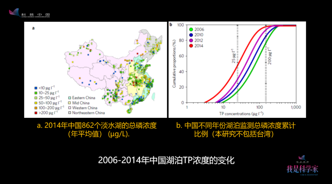 這個(gè)中國(guó)地圖表明我們有很多的污染物沒有處理好,就會(huì)進(jìn)入到湖泊里面。這個(gè)地方講的是磷會(huì)到我們的湖泊里。如果沒有處理好,氮也會(huì)到湖泊里去,也會(huì)到各種水體里去。